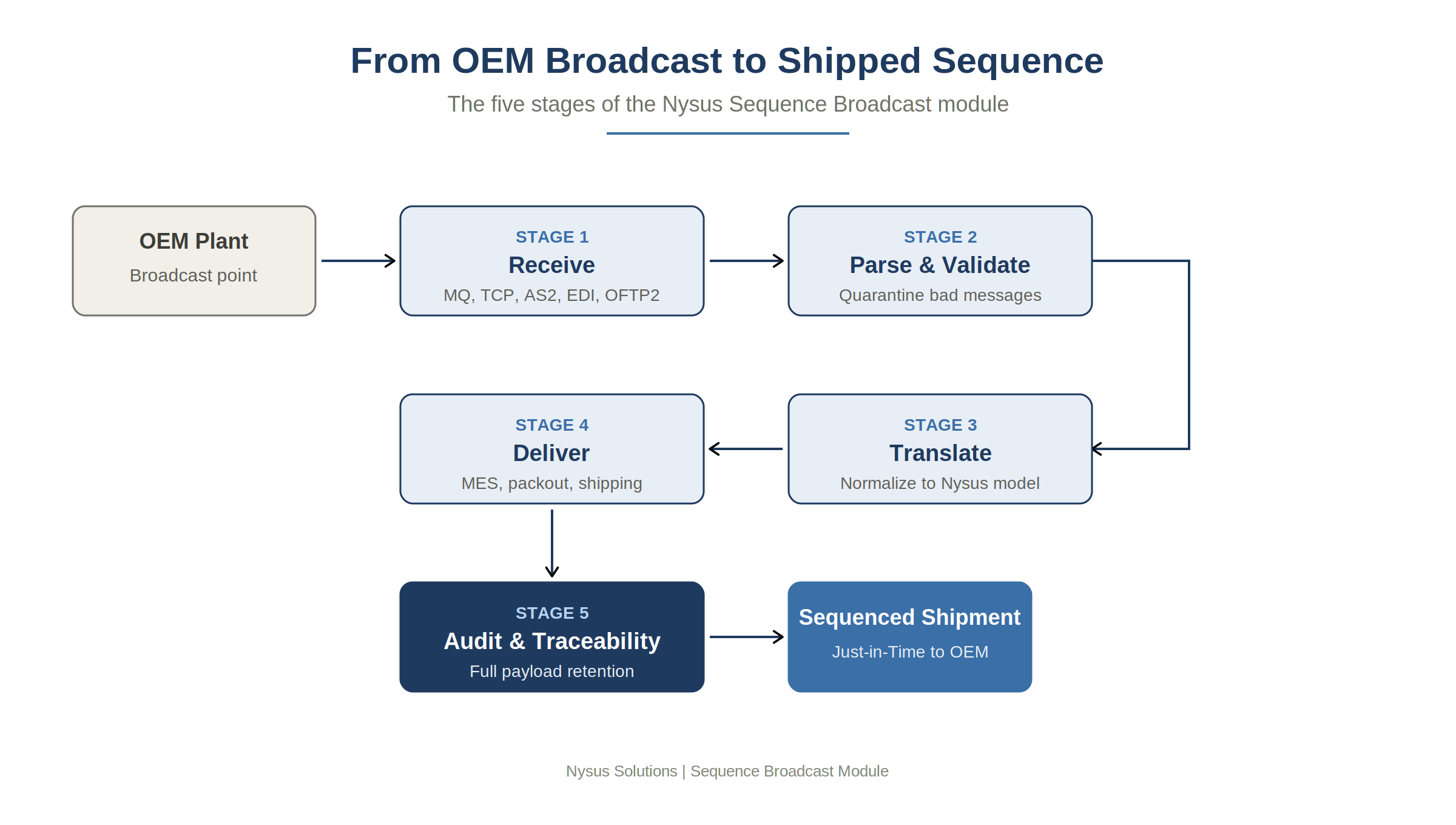 Sequence Broadcast is a native module of the Nysus Solutions Manufacturing Execution System — not a bolt-on or third-party add-in. When an OEM transmits a broadcast message at Paint Exit, Trim Entry, or any defined sequencing gate, the Nysus Broadcast module captures it, validates it, and hands normalized build data directly to the rest of your Nysus MES in real time. The same platform that drives your work instructions, traceability, downtime tracking, and PLC integration also orchestrates your just-in-time and just-in-sequence operations. One system. One user interface. One vendor accountable for the entire shop floor.